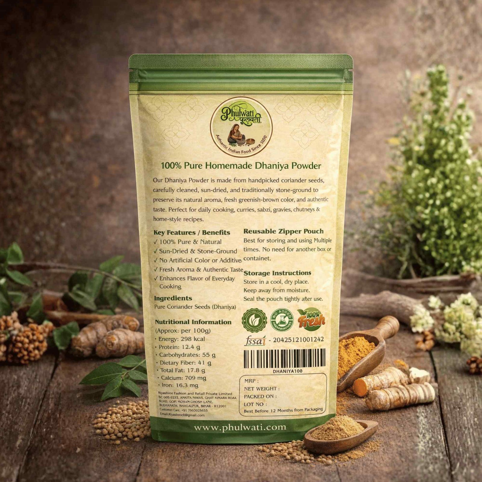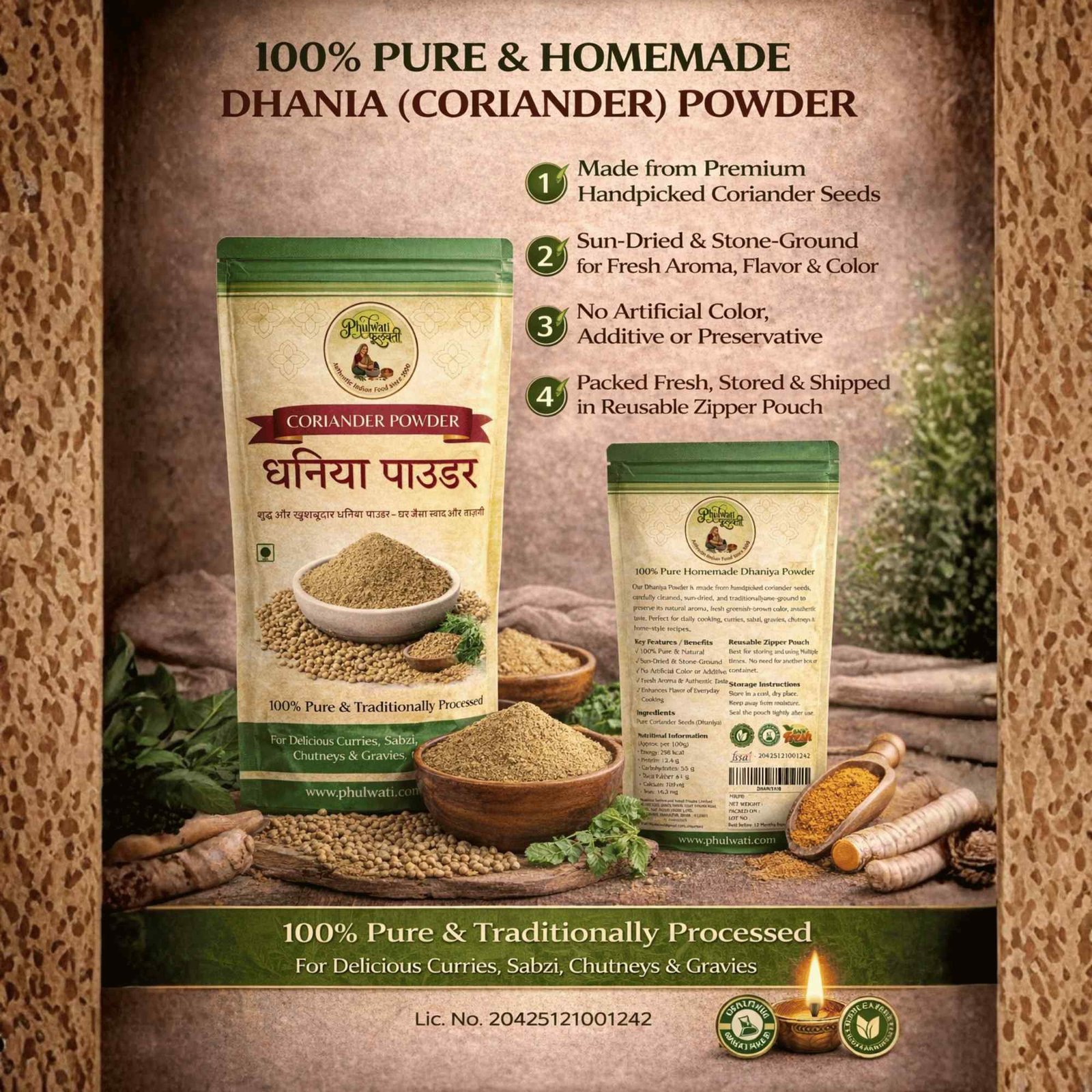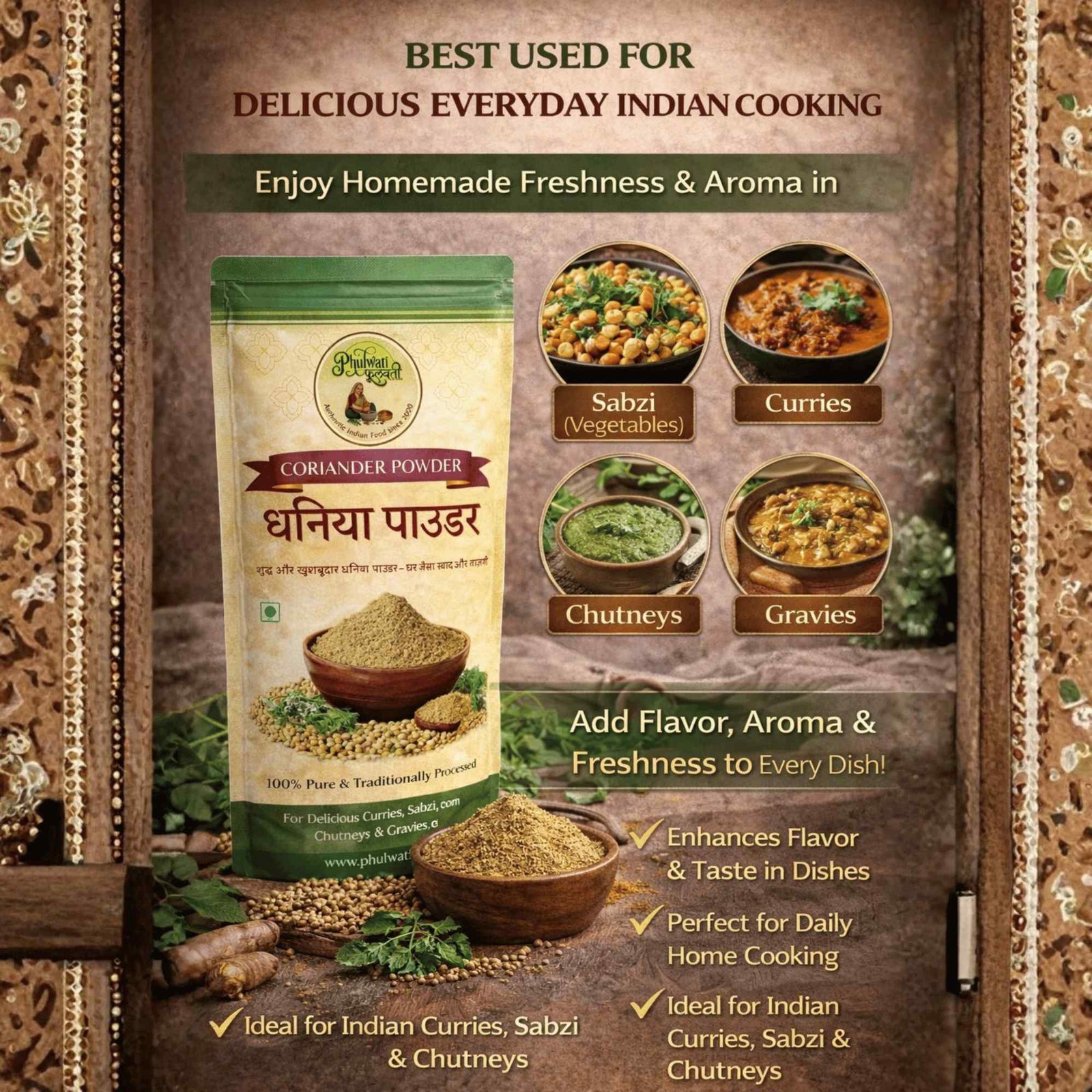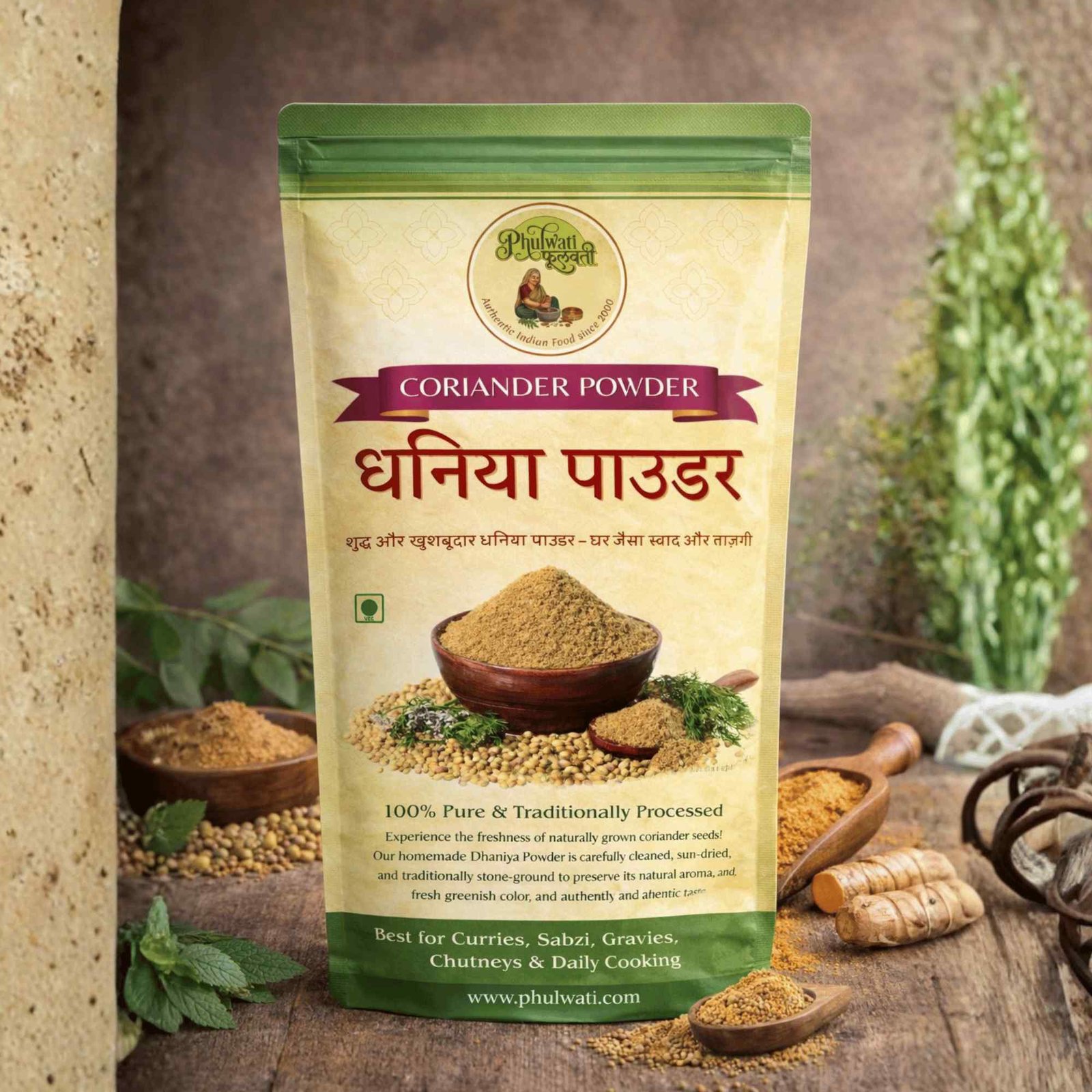 Phulwati Dhaniya Powder (Coriander Powder) – 100% Pure & Homemade | Traditionally Stone-Ground | No Added Colors or Preservatives | Authentic Indian Spice